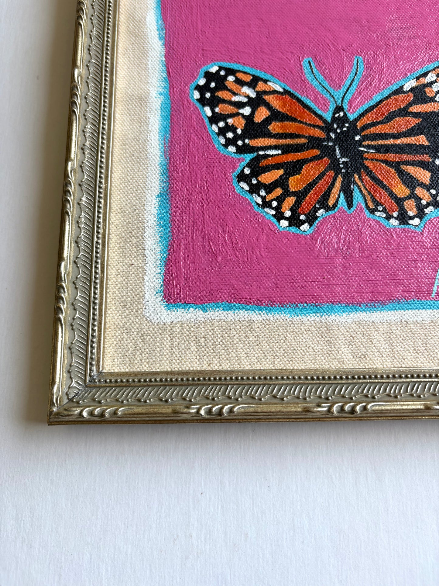 This solid wood frame was made by local Dallas artisans and specifically chosen to accentuate Deep Pink Monarch. Timeless detailing provides a finished, gallery-ready presentation.